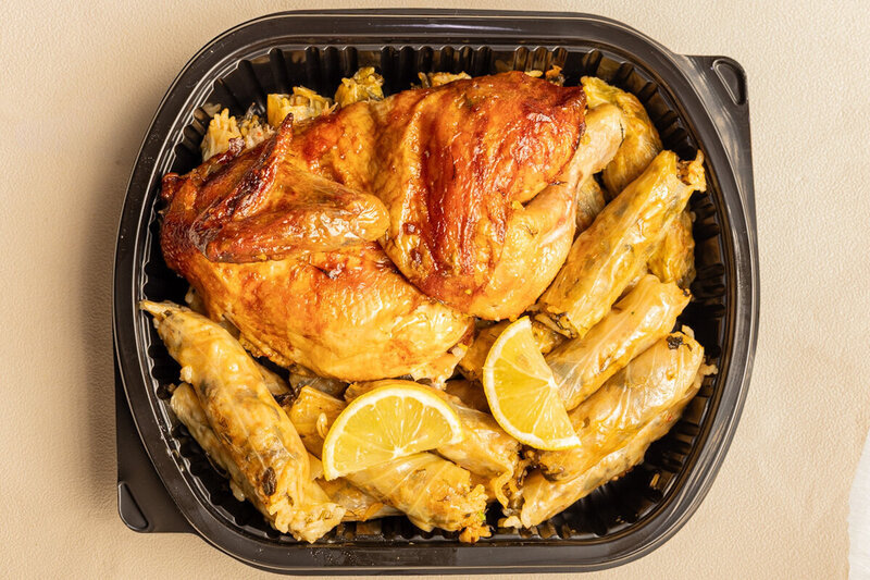 Half roasted chicken with stuffed cabbage rolls & lemon